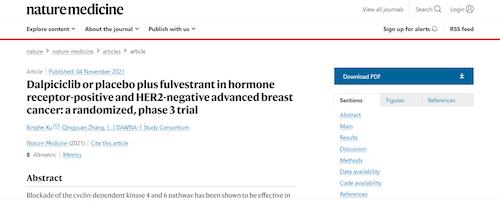 11月4日,国际四大医学期刊之一、英国《自然》旗下《自然医学》(Nature Medicine)在线发表CDK4/6抑制剂达尔西利(SHR6390)联合氟维司群治疗既往内分泌治疗后疾病进展的HR+/HER2-晚期乳腺癌的多中心、随机、双盲III期临床研究(DAWNA-1研究)中期分析结果报告,首次对氟维司群(雌激素受体降解剂)±达尔西利治疗激素受体阳性晚期乳腺癌的有效性和安全性进行了比较。研究结果显示,达尔西利+氟维司群组与安慰剂+氟维司群组相比,无进展生存期(PFS)显著延长。该项研究由中国医学科学院肿瘤医院徐兵河教授担任leading PI,全国39家医院参研,由尊龙凯时医药临床研发团队支持完成。